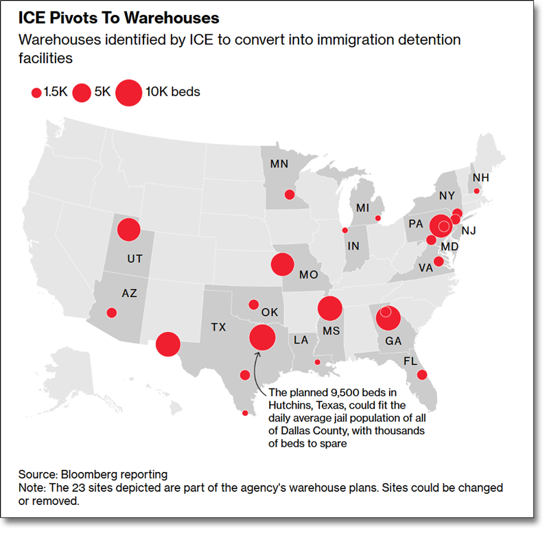 oder Malls ("Warehouses") für die Errichtung von zusätzlichen Gefängnissen für abzuschiebende Immigranten. Wie die letzten Monate und Wochen gezeigt haben,