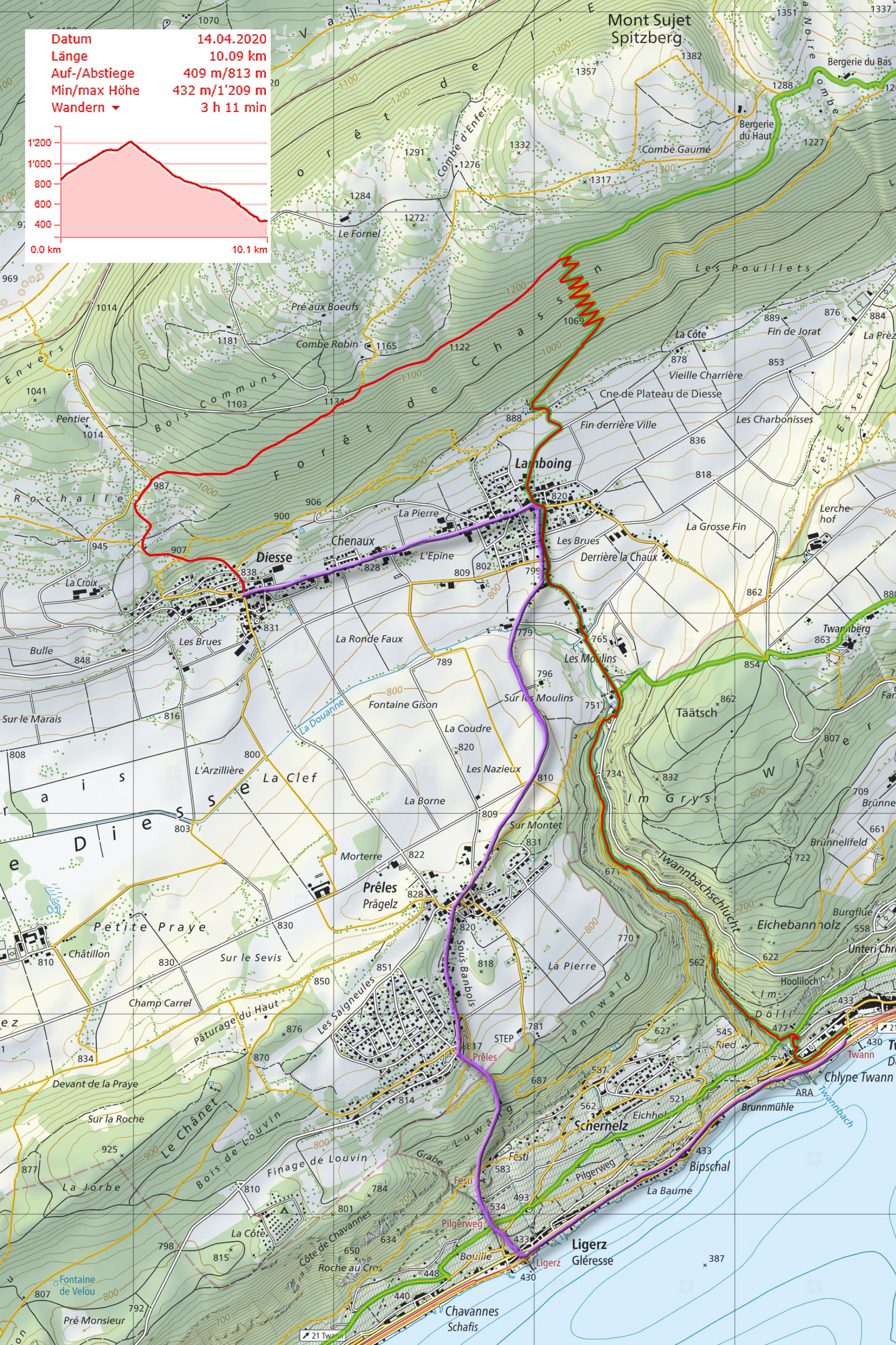 fuhr mit dem Zug bis Ligerz, dann mit "Funi" (Standseilbahn) bis Prêles und schliesslich mit dem Postauto über Lamboing nach Diesse (auf der Karte violett