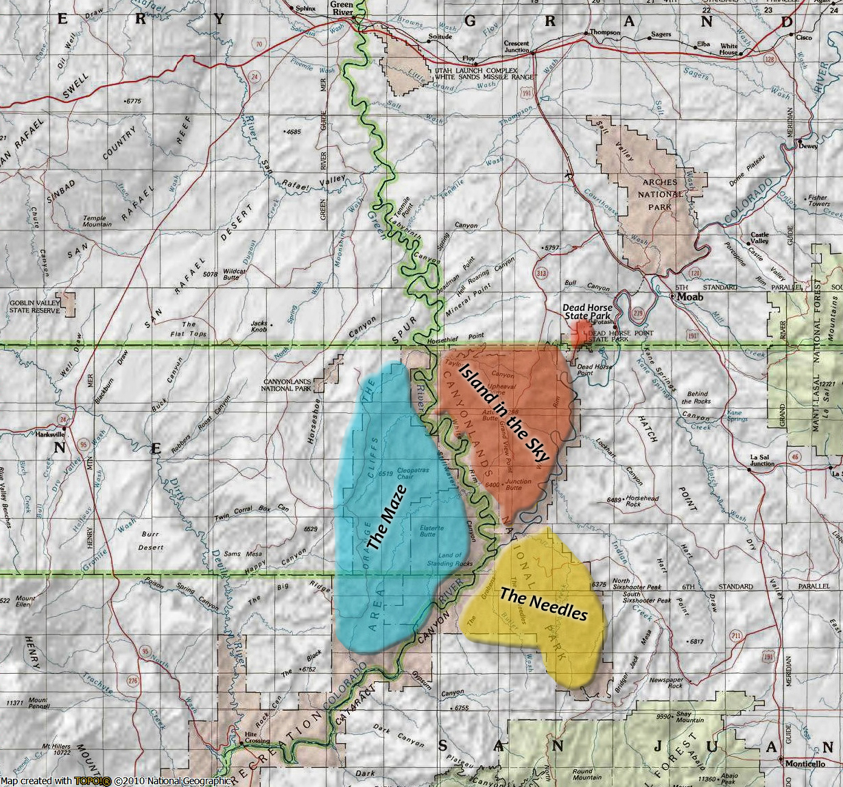 River im Westen und dem Colorado River im Osten. Im Südosten des Nationalparks (zwei Autostunden von Moab entfernt) liegen