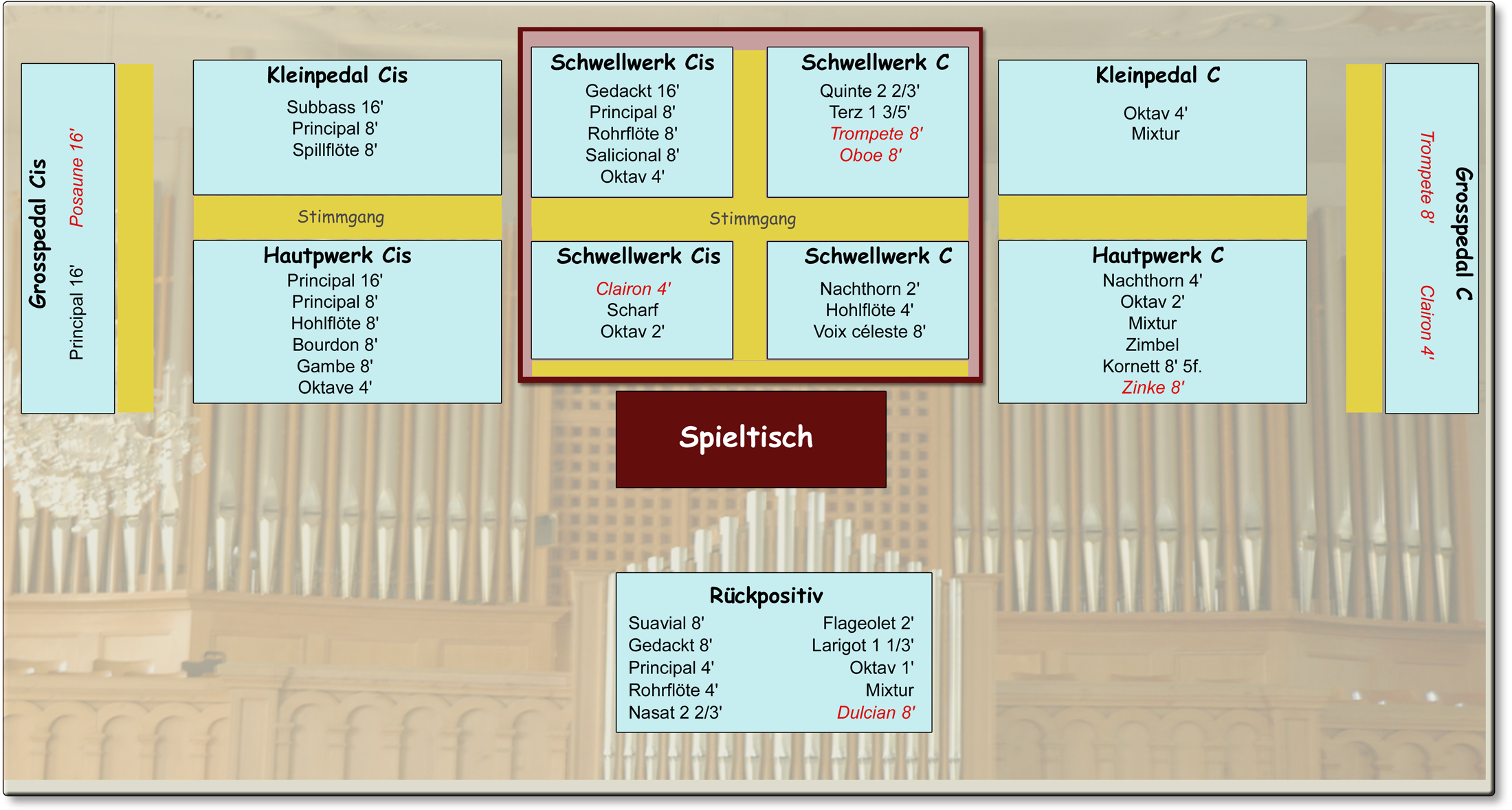 C- und Cis-Lade verteilen. Das heisst aber nicht, dass die entsprechenden Pfeifen nur auf dieser Lade stehen, sondern sie sind immer auf beide Laden