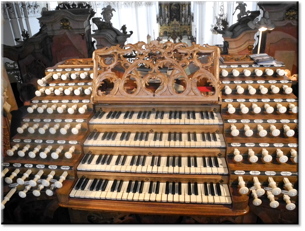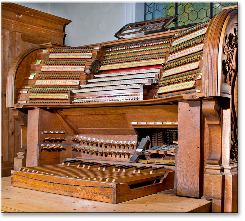 Orgel aus dem Barock hatten und haben einen einfachen Spieltisch: Beidseits der Manuale sind beschriftete Stöpsel als Registerzüge. Ein schönes