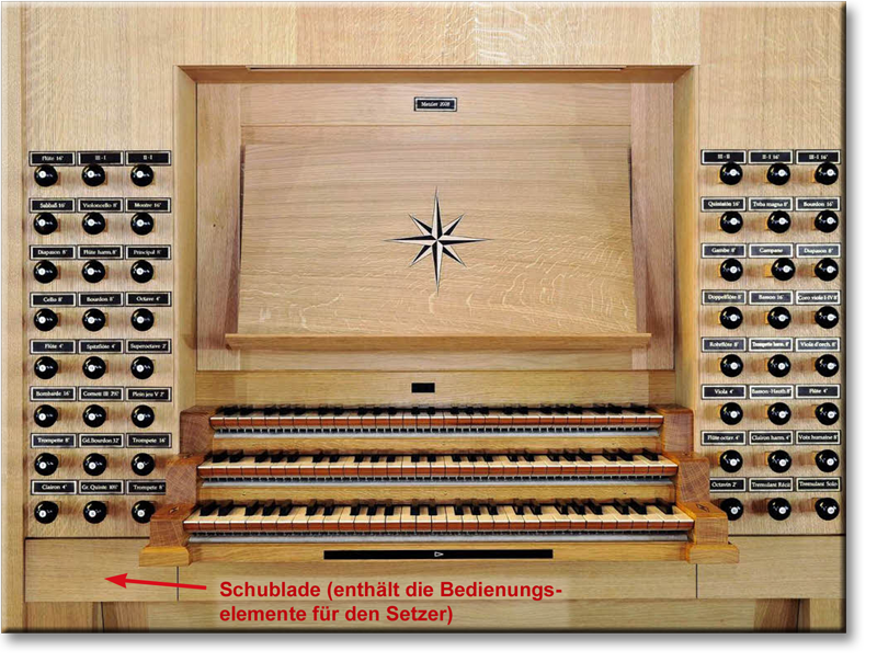 Heutige Orgeln haben meistens einen Setzer eingebaut; damit lassen sich beliebig viele Registrierungen abspeichern. Die Elektronik "versteckt" sich