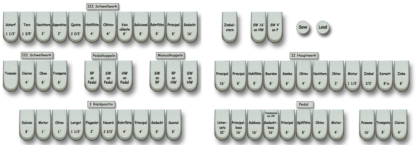 Die Orgel hat 4 Speicherblöcke à 512 Kombinationen (Registrierungen). Das scheint viel zu sein, aber ich habe mal überschlagsmässig