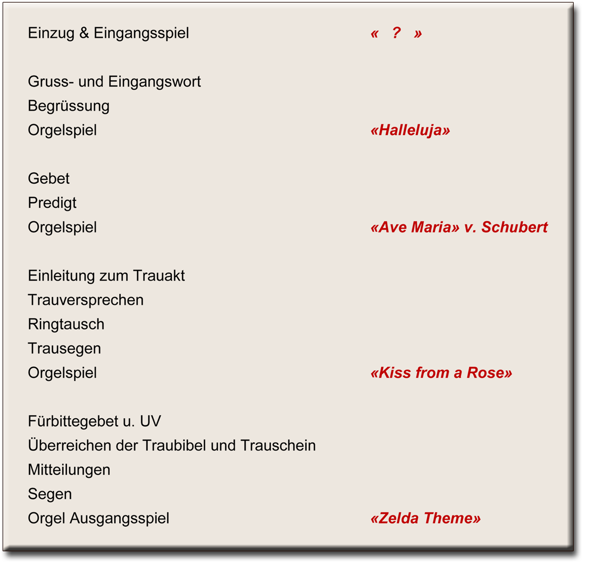 Da muss ich doch einfach den musikalischen Wünschen eines solchen Brautpaares nach Möglichkeit entgegenkommen. Dabei spielt es (wenigstens für mich)