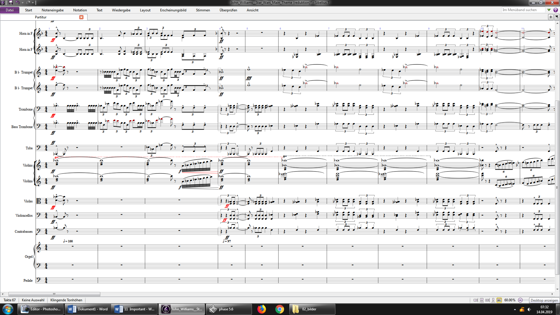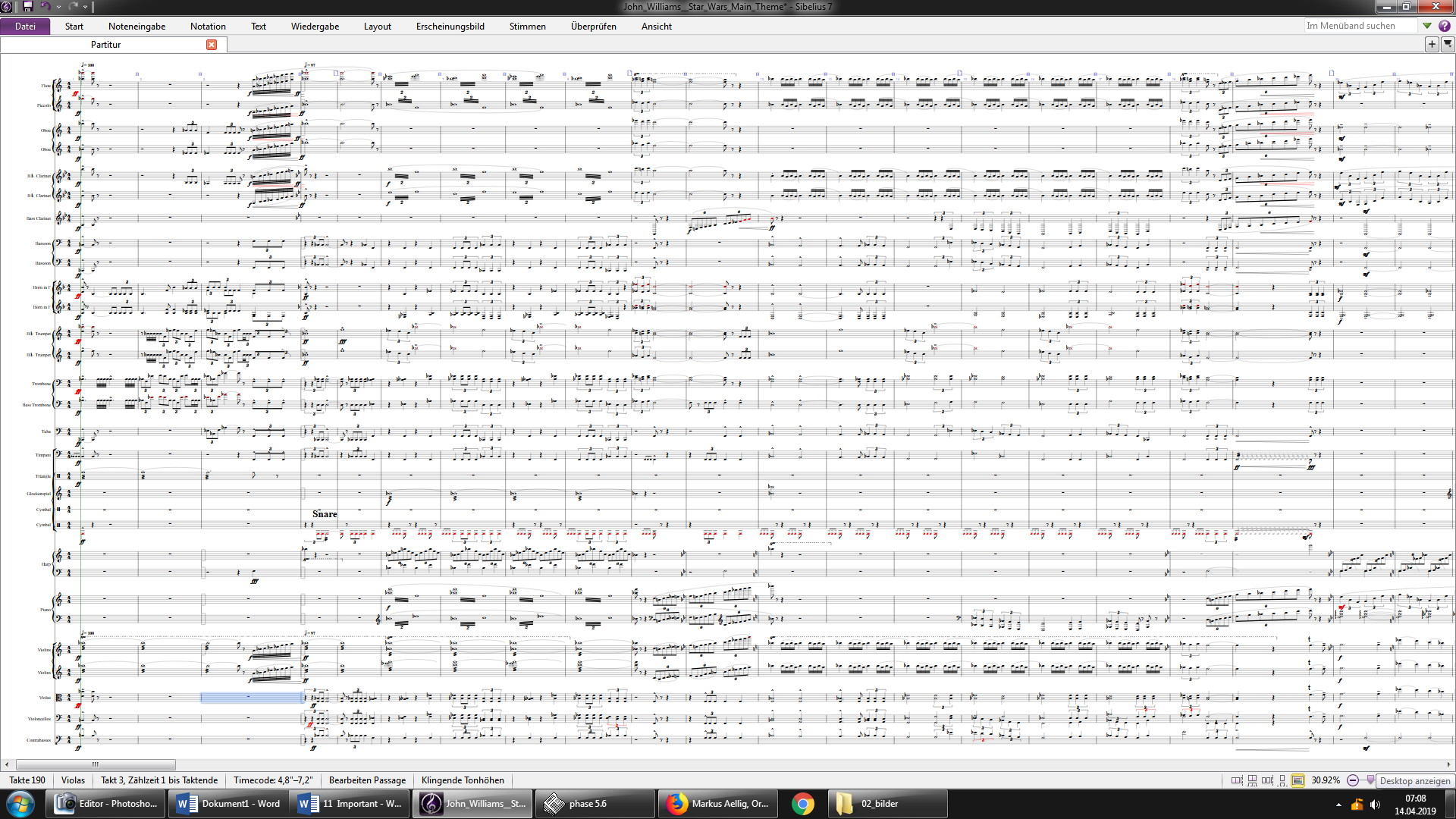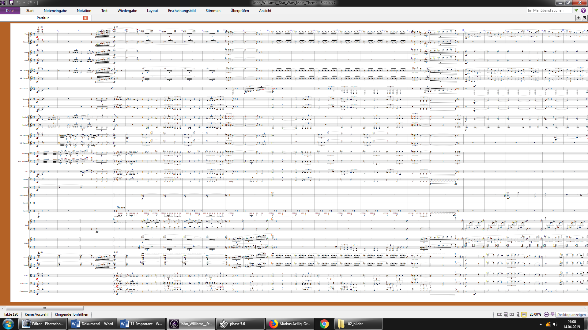 Es wurde langsam übersichtlicher. Aber jetzt musste ich wieder drei Systeme für die Orgel einfügen. Dann vergrösserte ich die Ansicht, bis ich