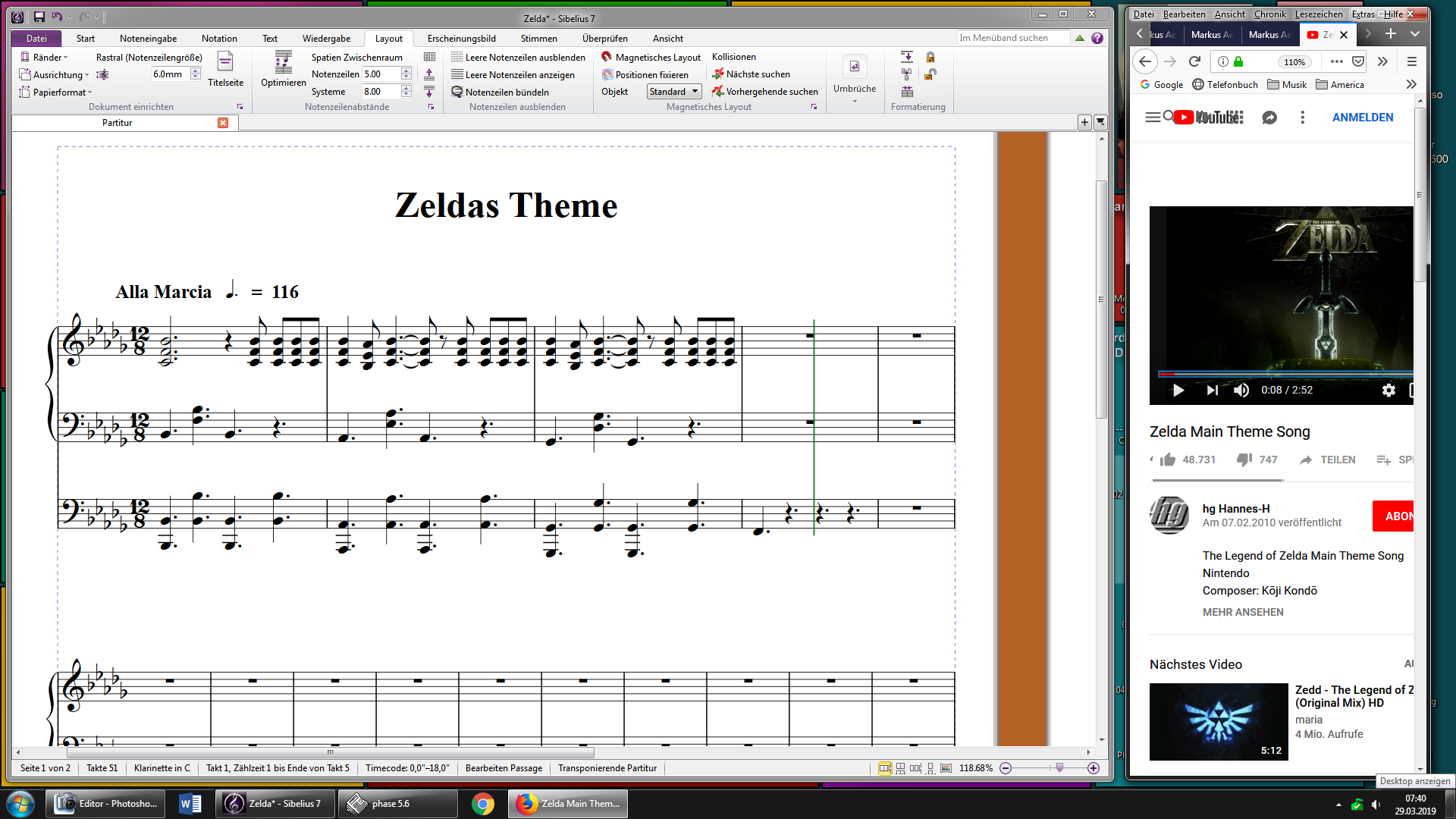 Und so sieht es auf meinem Bildschirm aus: Rechts ein kleines Browserfenster, links das grosse Sibeliusfenster, und ich pingponge dauernd zwischen