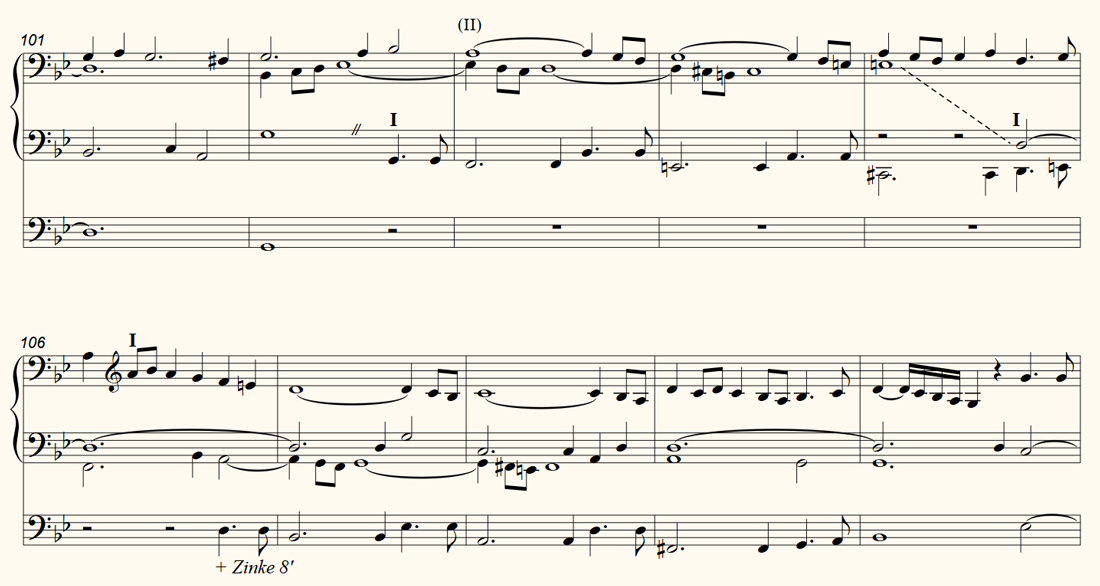 Ab Takt 102 wird es dramatisch. Zuerst geht der der Tenor aufs Hauptwerk; Alt und Sopran folgen bald darauf. Der Klang wird mächtig und ist trotzdem