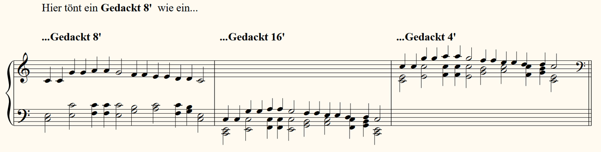 eine Oktave spiele, dann spiele ich mit dem Gedackt-16'Klang, und wenn ich eine Oktave höher spiele, so spiele ich mit einem lieblichen Gedackt-4'-Klang.
