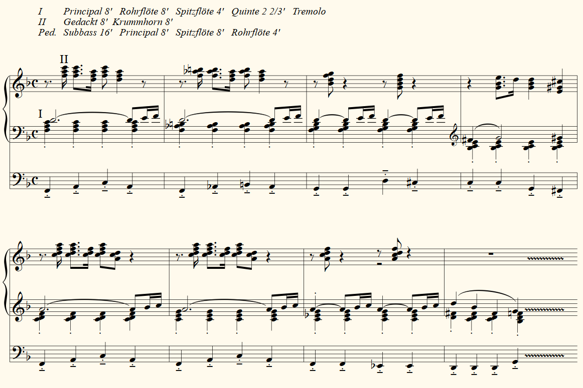 und angekoppeltem Manual. Beim Schlussakkord spielte ich im Pedal nicht nur den Grundton, sondern zusätzlich die Quinte darüber.
