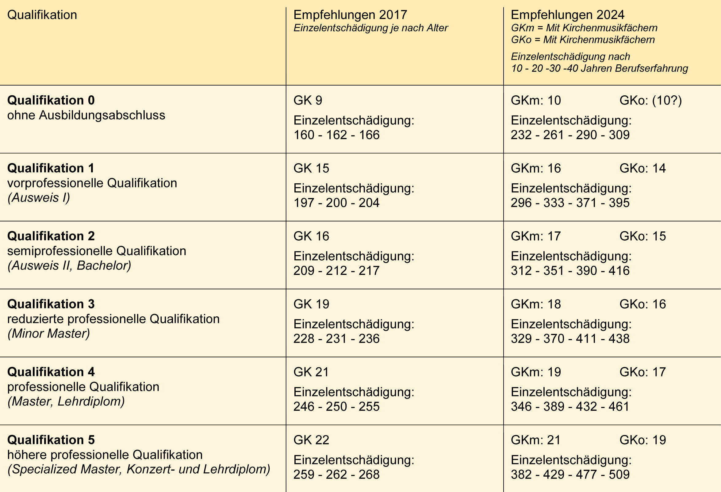 Empfehlungen von 2017 teilen ihre Honorarempfehlungen auf 6 Qualifikationen auf. Innerhalb einer