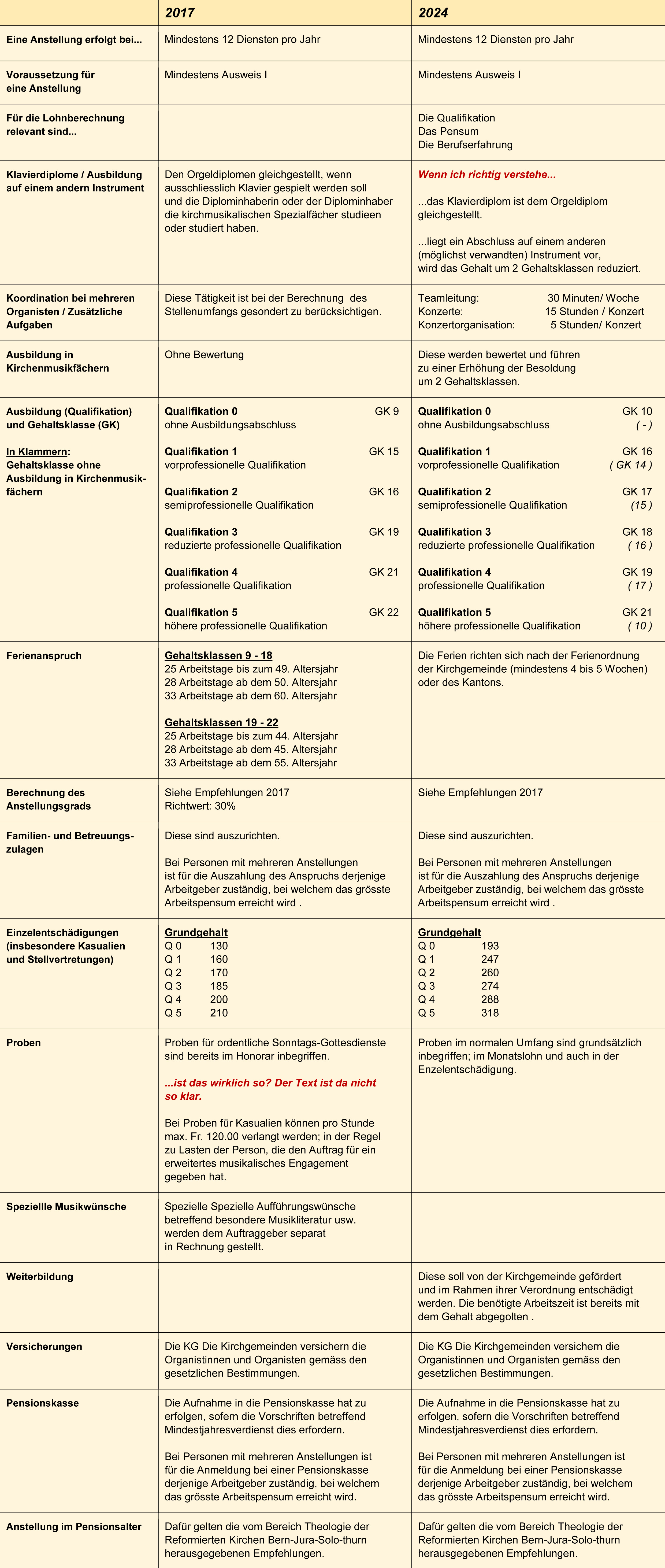Der Synodalrat und der Bernische Organistenverband empfahlen 2017 und empfehlen heute folgende Lohnklassen und
